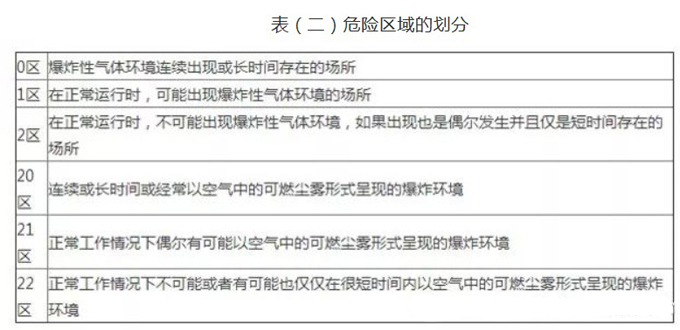 根據(jù)爆炸性環(huán)境的頻率和持續(xù)的時(shí)間把危險(xiǎn)場(chǎng)所劃分為不同的區(qū)域。氣體場(chǎng)所劃分為三個(gè)區(qū)域:0區(qū),1區(qū)和2區(qū);粉塵場(chǎng)所分為三個(gè)區(qū)域:20區(qū),21區(qū)和22區(qū)。如表(二)所示: