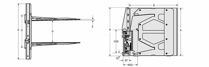 | Capacity 承載能力(kg) | Catalog Order NO 型號 | Mounting Class 安裝等級 | Load Center載荷中心(mm) | Opening Range張臂范圍(mm) | Arm Height臂高A(mm) | Arm Length臂長B(mm) | Arm Thickness臂厚E(mm) | Overall Width總寬D(mm) | Overall Height總高H(mm) | Vertcial Center Of Gravity垂直重心VCG(mm) | Hook Spread上鉤外側(cè)間距(mm) | Weight 自重(kg) | Effective 失載距ET(mm) | Horizontal Center of Gravity 水平重心CGH(mm) |